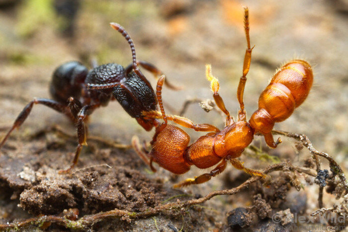 Разведчица Rhytidoponera victoriae в темном панцире с (здесь не видно) металлическим отливом обнаружила рабочую Stigmatomma ferruginea и напала на нее. В случае победы (а у стигматоммы – специализированного подземного хищника – на открытом пространстве мало шансов) ритидопонера убьет противника, утащит в свое гнездо и пустит на корм своим младшим сестрам- личинкам.