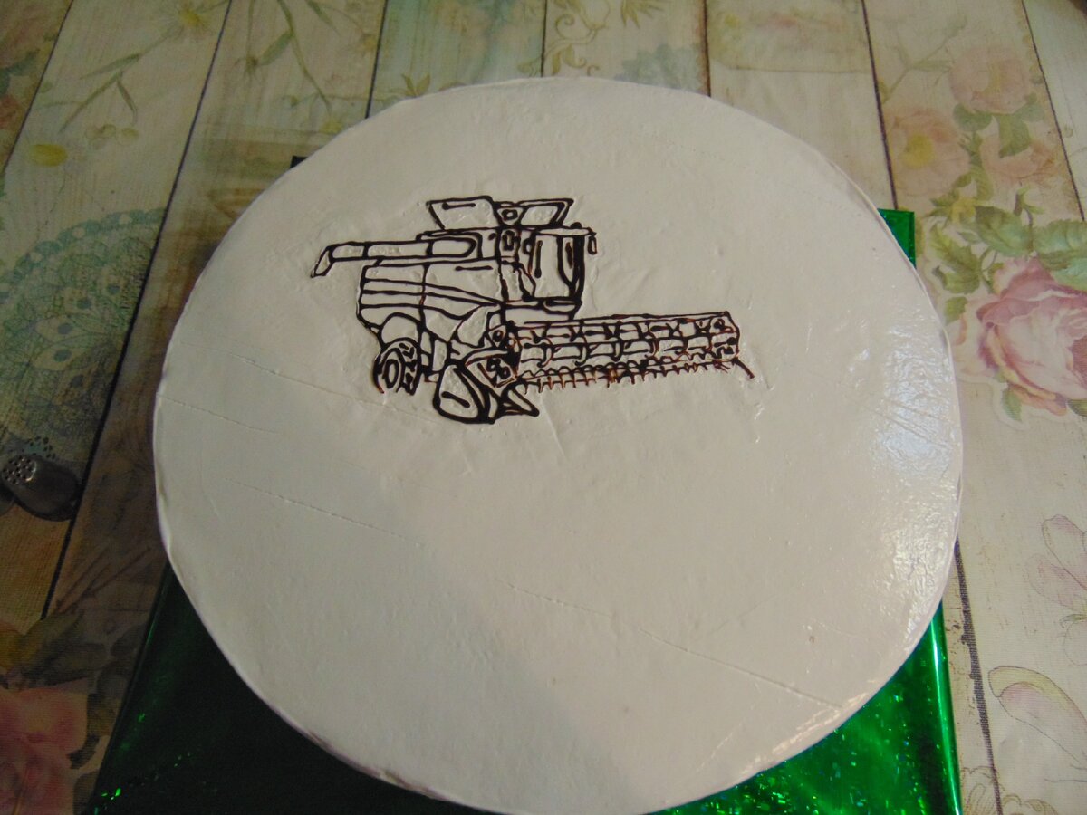 Добрый день дорогие читатели, сегодня в статье расскажу и покажу один из тортов которые мне довелось недавно приготовить и украсить. Торт готовила ко дню рождения, виновник торжества - фермер, вот и украсить попросили в схожей тематике. Мне уже приходилось работать в этой тематике, поэтому в качестве украшения решила нарисовать комбайн на пшеничном поле. Ну и теперь самое интересное, как проходил процесс. Первым делом наносим изображение комбайна. Шаг второй, раскраска комбайна. Далее создаем пшеничное поле. Теперь осталось украсить боковую поверхность торта, решила использовать подсолнухи. Вот такой торт получился, буду рада вашим оценкам.