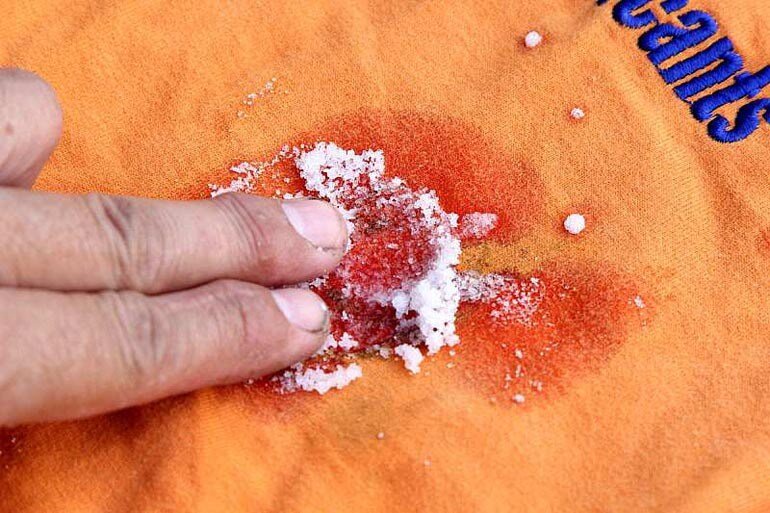 Все смешайте и полученную пасту нанесите на пятно щеткой. Пусть высохнет и прополосните в холодной воде.
