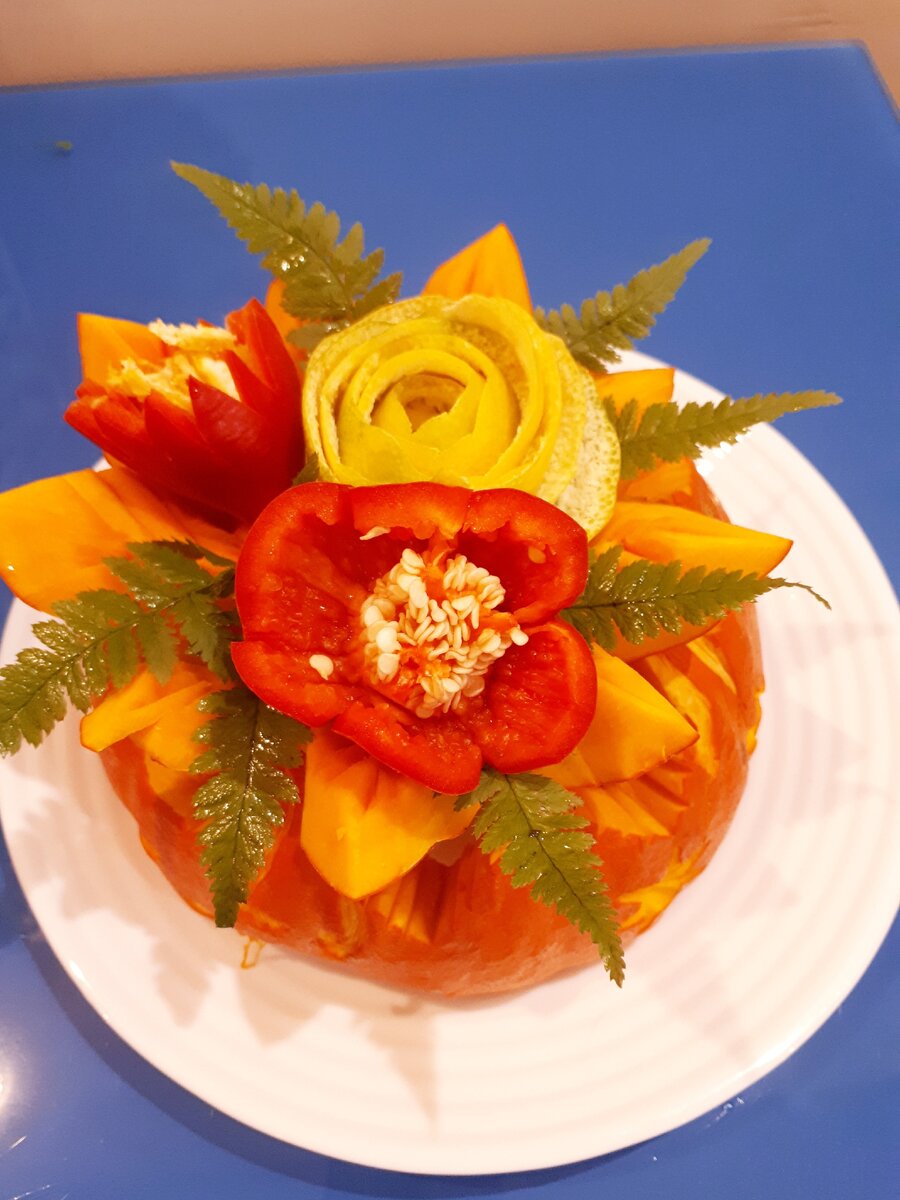 Для карвинга, тыква самый хороший, красивый и удобный для вырезания материал. Вазы из тыквы могут неделю украшать ваш стол, если правильно хранить вырезанный материал. Днем стоит на столе, а на ночью можно ставить в полиэтиленовый пакет и в холодильник. Сегодня я выкладываю снимки, что я вырезала из тыквы. На этой картине подставка для цветов из тыквы, а цветы из болгарского перца и корочки мандарина. На этой картине тыква, а рядом вазы из памело и цветы из болгарского перца с листьями свежего сельдерея. Далее из этой тыквы я вырезала маленькую вазу и подставку. На вазу из тыквы я ставила цветы, вырезанные из корочек мандарина. На этой картине на подставку из тыквы поставила вазу с цветами из памело. На этой картине цветы из перца болгарского поставила рядом с подставкой, а листья свежие при этом украшают композицию. Еще из тыквы можно вырезать шляпу красивую и девушку. Эти цветы тоже вырезаны из тыквы, из одной тыквы получается три цветка. На этой картине маленькая ваза из тыквы, а на