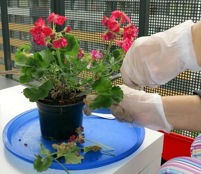 В последние месяцы осени цветок перестаёт расти, накапливая и экономя ресурсы для того, чтобы интенсивно развиваться на следующий год. В это же время я подготавливаю герань к долгой зиме. В первую очередь произвожу обрезку. Эта процедура имеет непосредственное влияние на её будущий рост и цветение.