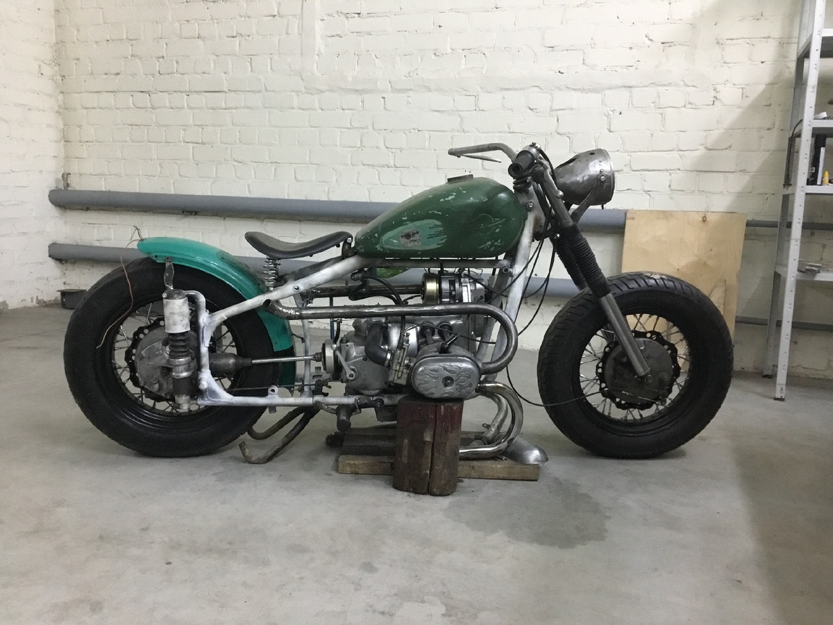 Ребята всем привет! Я не писатель и просто делюсь своими мыслями и может некоторыми сложностями в процессе постройки Боббера . Писать как писатель не умею по этому если есть вопросы задавайте их в комментариях или в Группе ВК название : Запчасти на мотоциклы . Мото Разбор . СССР Это моя группа и создал я ее больше для того что бы люди могли найти себе запчасти по дешевле а не в три дорога . вообщем вот что у меня сейчас : Вот в таком виде он был и я разобрал его в 0 что бы наконец то отпескоструить и покрасить . При помощи сварки и болгарки приделал глушитель держится на мой взгляд крепко (надеюсь от вибраций не отлетит ) ну что осталось совсем немного что бы выводить его в то что я представляю себе . Кстати у ребят у кого есть желание спрашивайте подскажу что где покупал и от чего и как крепил . Даже мне не имея опыта показалось все легко .... ну или как то так . я не профессионал просто люблю мотоциклы а на хороший не хватает очень много денег )) нас таких много всем