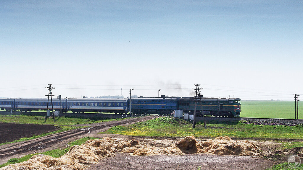 "Это сладкое слово "погоня"! Ни один детектив не обходится без погони. Один удирает, другой догоняет..." Догонялки с поездом - это наше самое любимое :-) Дело было давно - это видно по окраске поезда, "сейчас таких не делают". 18 мая 2008 г. Очень неожиданно было встретить такой разноцветный тепловозный гибрид из двух секций из разных депо, находящихся одно от другого на расстоянии около 400 километров. Причём вторые секции обоих тепловозов в то время были живы и здоровы, часто ходили "половинками" с пригородными поездами. Тепловоз находится на том же месте, что и на первом снимке в предыдущем посте, только направление движения противоположное. Из "бытовых" неудобств - мы находимся на теневой стороне по отношению к поезду. Пойти снять с другой стороны, конечно, можно, но это будет другой снимок, другая тема: верхней точки не будет, на фоне появятся холмы, домики, лесополоса, люди, машины, суета... Вернёмся, однако, к "пассажиру". Поезд идёт быстро, но впереди через 10 километров небол