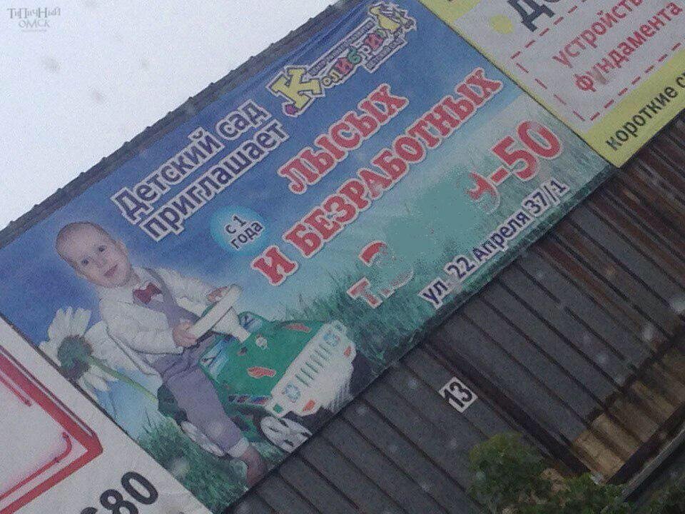 Давайте вместе немного отвлечемся от рутины и посмотрим, что я вам сегодня приготовила! Реклама это важная составляющая бизнеса. Задача каждого маркетолога привлечь как можно больше клиентов для заказчика. А как это сделать? В первую очередь необходимо завладеть вниманием обывателем, зацепить его взгляд. Вот и идут рекламщики на всякие ухищрения балансирую на грани фола. Ведь закон о рекламе очень строг и суров, и одно не ловкое движение и можно получить приличный штраф! Но некоторые всё равно идут на рискованные поступки. Начнем мы пожалуй с самой безобидной рекламы в сегодняшней подборки. Говорят проблемы с детскими садами, нет мест, трудно ребенка записать. Наверно эти времена прошли, и теперь за деток борются, привлекая их родителей вот такой веселой и очаровательной рекламой. "Приглашают лысых и безработных" Я работаю в