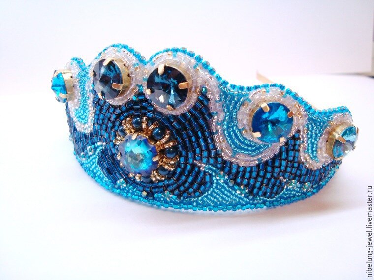 Для работы потребуется: 1) Риволи 12 мм — 6 штук: 3 пары различных оттенков синего. У меня это были Сваровски — монтана и аквамарин и пара ярко-бирюзовых риволи no name. 2) Оправы для кристаллов, 6 штук для риволи и 1 для «Медузы». 3) Кристалл Сваровски Медуза 14 мм. 4) Основа для ободка 6 мм. 5) Жемчуг Сваровски 4 мм petrol, мелкие бирюзовые кристаллы в кастах 3 мм, бусины-рондели 3 мм темно-синего цвета. 6) Мелкий японский бисер серебряного, золотого, жемчужного и голубого цвета. 7) Рубка чешская темно-синяя, и прозрачная. Голубой чешский бисер 10. 8) Основа для вышивки белая. Картон, кожа натуральная белая. 9) Ножницы, иголки бисерные, клей. Приступаем к работе. Для начала