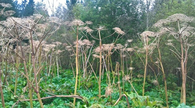 У ближайшего поворота меня встречает довольно крупный пёс, но пугаться оснований нет – собака настроена очень дружелюбно и вызывается меня проводить. Тут же натыкаюсь на заросли борщевика выше человеческого роста – выглядит это прямо как первобытный лес.