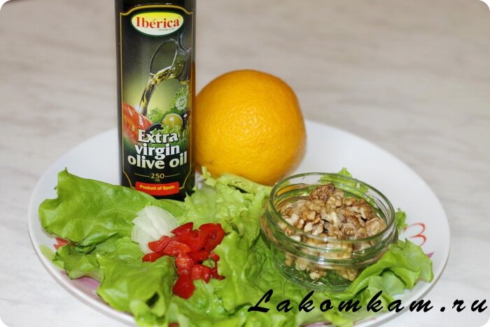 Ингредиенты: крупный апельсин — 1 штука; грецкие орехи — 50 грамм; лук-порей — 20 грамм; болгарский красный перец — половина 1 штуки; листовой салат — пучок; оливковое масло «Iberica» Extra Virgin — 50 грамм; апельсиновый сок — 30 грамм.