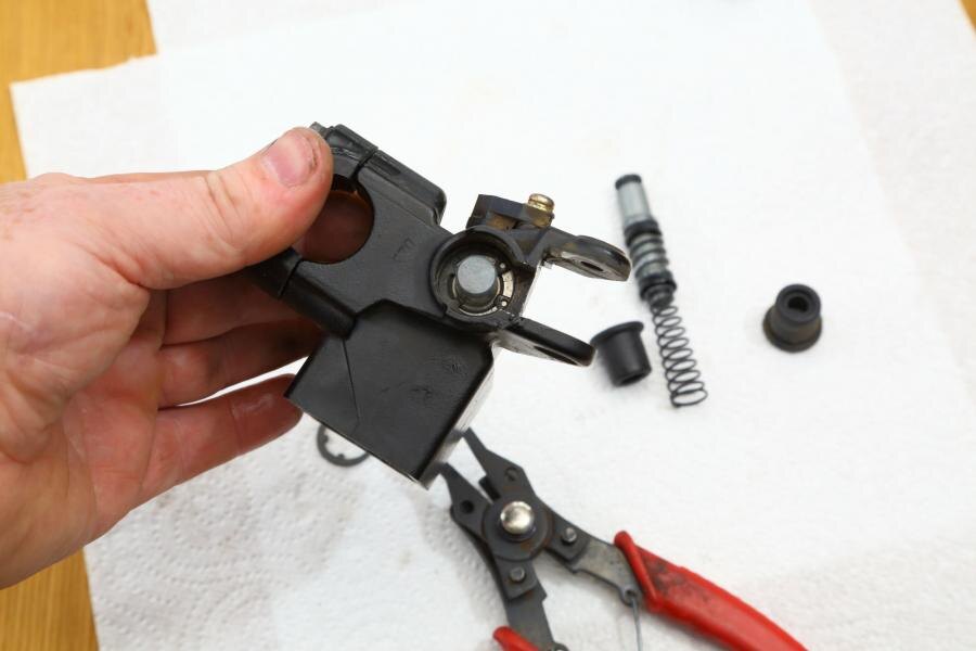 Сохраняем остроту старых тормозилок Тормоза состоят из двух половинок (ну, трех, если говорить о системе с ABS). Нижней половине обычно достается все внимание: колодки регулярно меняют, суппорты чистят и прихорашивают, шланги меняют на армированные, у дисков проверяют степень износа. А вот в верхней половине, в главном тормозном цилиндре, сидящем на руле, обычно ничего не происходит. Вы открываете его для замены жидкости, а если уроните байк, то меняете гнутый или сломанный рычаг. Но в руководстве по обслуживанию сказано, что сальники в главном тормозном цилиндре нужно регулярно проверять и менять. Это простой поршень с парой резиновых сальников, расположенный в цилиндрическом отверстии – но сальники и правда со временем изнашиваются, и их замена может придать остроты старым ковыляющим тормозилкам. Рекомендуем: Смазка тросов тормоза на мотоцикле И вот как перебрать обычный цилиндр тормоза (или сцепления) за пять простых шагов… Снять главные тормозные цилиндры Будем считать, что вы уме