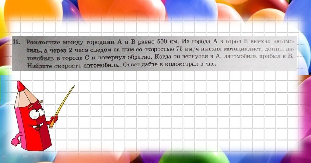 Как решить текстовую задачу, не запутаться, не впасть в ступор. У всех моих учеников были проблемы с задачами. Когда на пробном уроке спрашиваю про пожелания, на первом месте всегда задачи. Какие я сделала выводы, почему дети не могут разобраться с этой темой. Как я учу. Приведу пример задания №11 из профильного ЕГЭ, вызывавший затруднения у всех моих учеников. Несложная задача, на самом деле, ребенок, приученный думать, легко может решить. Задача: "Расстояние между городами А и В равно 500 км. Из города А в город В выехал автомобиль, а через 2 часа следом за ним со скоростью 75 км/ч выехал мотоциклист, догнал автомобиль в городе С и повернул обратно. Когда он вернулся в А, автомобиль прибыл в В. Найдите скорость автомобиля. Ответ дайте в километрах в час."