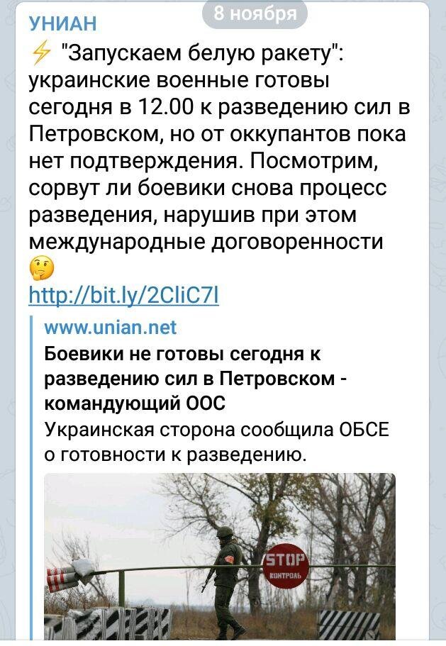 По сообщению СЦКК ДНР вчера в 20.50 с направления н.п. Богдановка по н.п. Петровское применяется стрелковое оружие... Т.е. Украина обстреливала н.п. Петровское, интересно, как наши меньшие мозгами небратья собираются сегодня отводить войска? Ну а после пальбы вчера, хто знает куды, из стрелкового оружия бандеровский сброд начал применять гранатометы... это на минуточку - та самая третья точка отвода, являющаяся условием встречи в Нормандском формате. К стати, при этом время работы СММ ОБСЕ заканчивается в 18-00, но сваливают они как стемнеет, потому что в темноте они никак все равно не могут работать. А фиксируют ли их камеры нарушения режима тишины в пятикилометровой зоне - одному Господу известно. И, поскольку предвзятое отношение к ЛДНР СММ ОБСЕ даже не обсуждается, вполне вероятно что действия бандеровских прямоходящих ишаков после 18-00 в отчетах миссии отражены не будут. Теперь о разводе сил... "Боевики группировки ДНР не подтвердили готовность к разведению сил и средств в рай