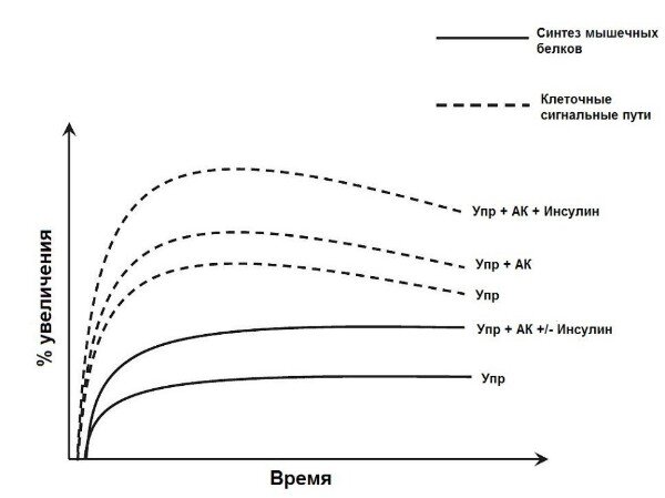 Рис. 4. Модель, показывающая как упражнения (Упр) и аминокислоты (АК) активируют анаболические сигнальные пути, инициирующие ответный СМБ. После достижения максимальной реакции дополнительное увеличение активации анаболических сигнальных белков (преимущественно через фосфорилирование) вероятно опосредуется инсулином, но не ведёт к дополнительному увеличению СМБ.
