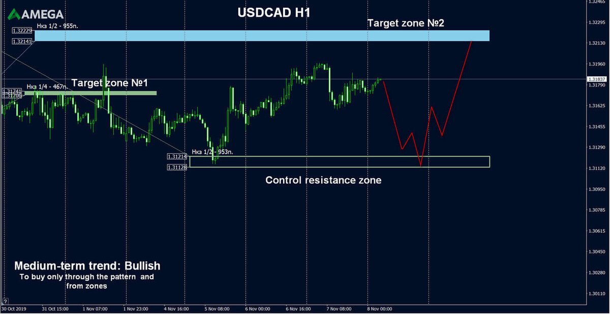Среднесрочная тенденция: Покупки Наблюдаем продолжение восходящего движения валютной пары USDCAD. Цена уже дошла до целевой зоны №1 1.31741-1.31706 и имеет потенциал дохода до целевой зоны №2 1.32229-1.32141. Любое нисходящее движение считается коррекционным. Самыми выгодными ценами для поиска покупок является контрольная зона сопротивления 1.31214-1.31128. В случае закрепления цены ниже контрольной зоны сопротивления среднесрочная тенденция сменится на нисходящую, и все покупки рекомендуется отменить. Торговые рекомендации: Рекомендуется искать покупки вблизи контрольной зоны сопротивления 1.31214-1.31128 (95 пунктов от текущего максимума) через паттерн «Голова и плечи» на таймфрейме минимум М15. Контрольная зона сопротивления построена от текущего максимума. В случае изменения данного максимума на n пунктов, зона также должна быть смещена на n пунктов вверх. Соотношение риск/прибыль каждой сделки рекомендуется иметь не менее 1/3. Все зоны построены на основе данных с фьючерсного р