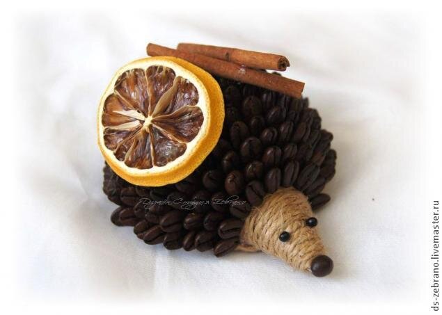 Материалы: кофейные зёрна, шпагат джутовый, бусины деревянные, шарик, пенопласт, термоклей, бадьян, корица, лимон