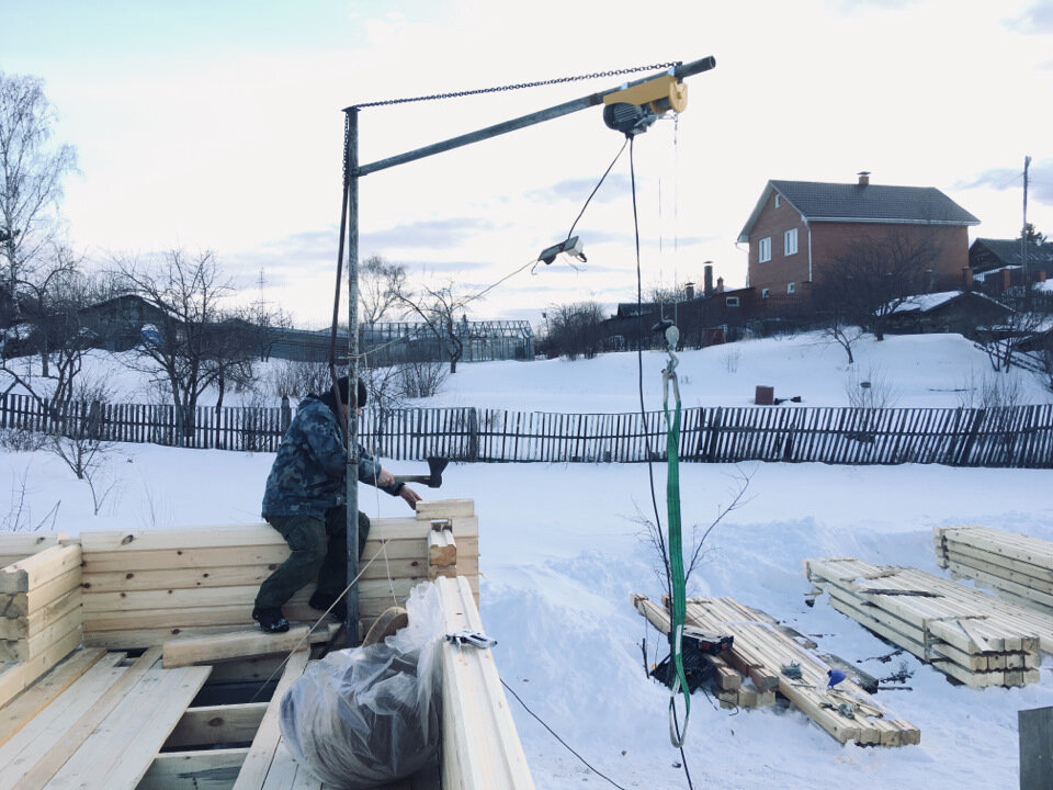 Для облегчения перемещения тяжелых предметов с подвала и обратно, а также по самому гаражу, оборудовал кран-балку. Тельфер был приобретен ранее и уже хорошо помог при строительстве бани (запись "Миникран для сборки сруба" есть в сообществе Кулибин Club). Сама 4 метровая кран-балка изготовлена и ранее испытана там же. Крыша гаража состоит из П-образных плит и две из них сходятся как раз по центру ворот и смотровой ямы и имеют наклон к воротам. Поэтому долго думать не пришлось. Перфоратором с буром на 14 мм просверлил отверстия и на обрезки шпилек М12 закрепил металлические полосы. Внутрь профильной трубы 40х20х3мм кран-балки хорошо поместились длинные соединительные гайки М10, а в них вкрутились кольцевые анкеры (ими хорошо отрегулировался уровень кран-балки), всего в 6 точках.Горизонтальный уровень отрегулировал при помощи лазерного нивелира. Есть желание на кран-балку изготовить систему подъема автомобильного тула и вообще, навести порядок, отделать и покрасить. П.С.Спешу успокоить не