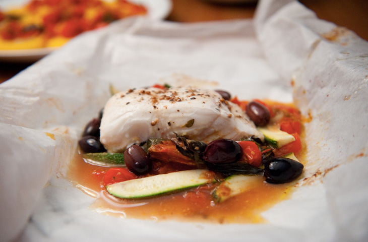 Соль и свежемолотый перец Способ приготовления: Духовку разогреть до 190 °C. В кастрюле с кипящей водой отварить в течение 1 минуты морковь. Добавить спаржу и сахарный горох и варить еще около 2 минут. Слить воду, выложить на тарелку и охладить. В сковороде нагреть 2 столовые ложки масла. Добавить лук и грибы, приправить солью и перцем, и варить на умеренно сильном огне, помешивая, до мягкости, 7 минут. Переложить на тарелку, дать остыть. Нагреть 2 больших противня. Выложить 8 13-сантиметровых листов пергаментной бумаги, смазать их оливковым маслом. На каждый лист скраю выложить овощи, а сверху рыбу. Приправить сол