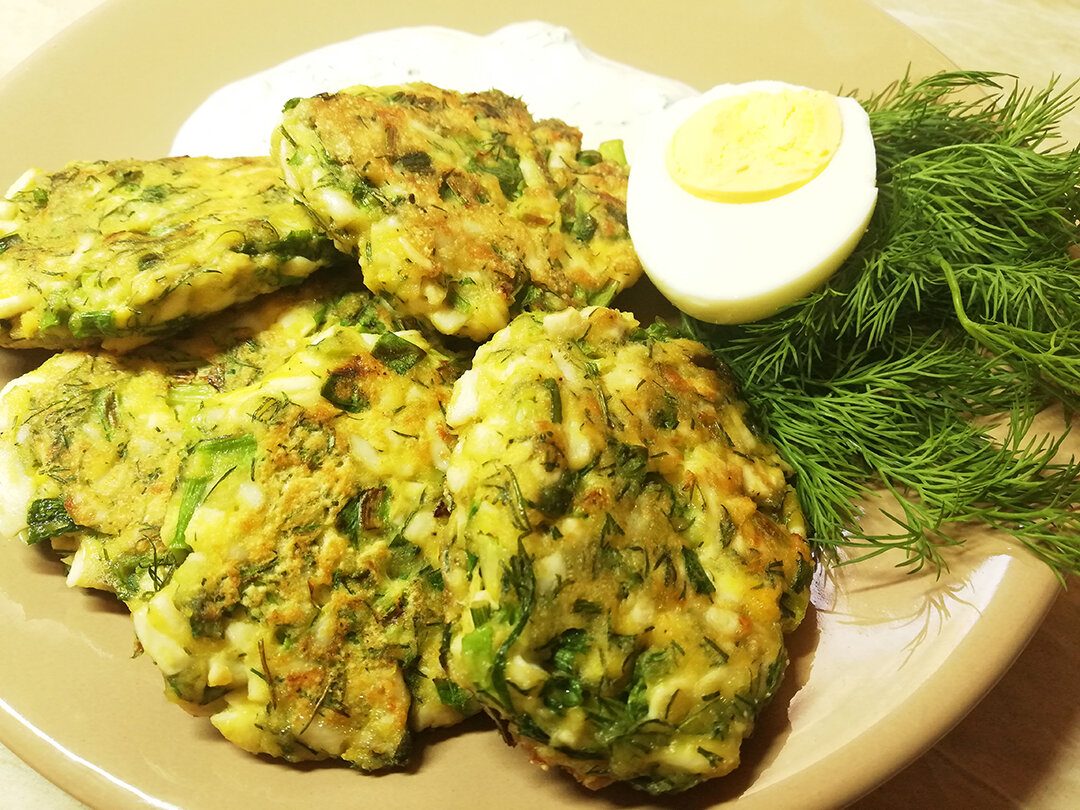Такого еще с яйцами ни кто не делал, быстрый завтрак, яичные котлеты с зеленью! Яйца пожалуй самый универсальный продукт, из них уже делали всё, жарили, варили, запекали, фаршировали! Но Котик нашел еще одно применение, и делится им с вами! Это вкусно и полезно, а еще быстро и дешево!) Присоединяйся и готовь! И так что вам потребуется: 1.) Яйца варёные - 6 шт. 2.) Укроп - 1 п. 3.) Яйцо - 1 шт. 4.) Лук - 1 п. 5.) Соль, перец - по вкусу 6.) Мука - 1 ст.л. 7.) Манка - 2 ст.л. 8.) Сметана - 1 ст.л. Приготовление: 1.) Варим и натираем 6 яиц. 2.) Нарезаем 1 пучёк зеленого лука и 1 пучёк укропа. 3.) В эту смесь добовляем муку, манку, яйцо, соль, перец, перемешиваем. 4.) Смачиваем руки водой, и делаем котлеты. 5.) Жарим на медленном огне под крышкой, до золотистой корочки! 6.) Подаем с сметаной, или любимым соусом.