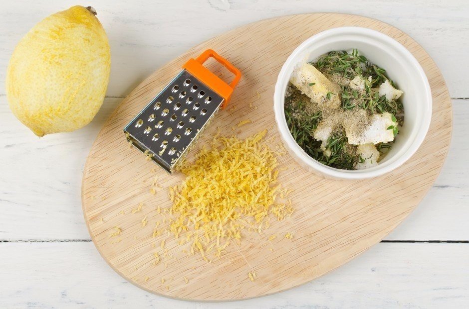 1. Приготовить маринад для курицы: натереть с лимона цедру и соединить с размягченным сливочным маслом (30 г), листиками тимьяна, солью и черным молотым перцем. Перемешать. 2. Натереть курицу внутри и снаружи этой смесью и оставить мариноваться в прохладном месте на 30 минут. 3. Нарезать яблоки крупными дольками. Зернышки, которые видны, убрать. 4. Наполнить брюшко курицы зелеными яблоками. Заколоть брюшко зубочистками, а ножки связать шпагатом. 5. Переложить курицу в жаропрочную форму, смазанную растительным маслом. Поставить запекаться в разогретую до 190°C духовку до готовности. 6. Приготовить сливочный соус: нарезать лук полукольцами, а зубчики чеснока — лепестками. 7. Обжарить лук и чеснок на растительном масле до золотистого цвета. В конце добавить лавровый лист и веточки тимьяна. 8. Растворить в части сливок муку, чтобы не было комков, а затем влить оставшиеся. Перемешать.