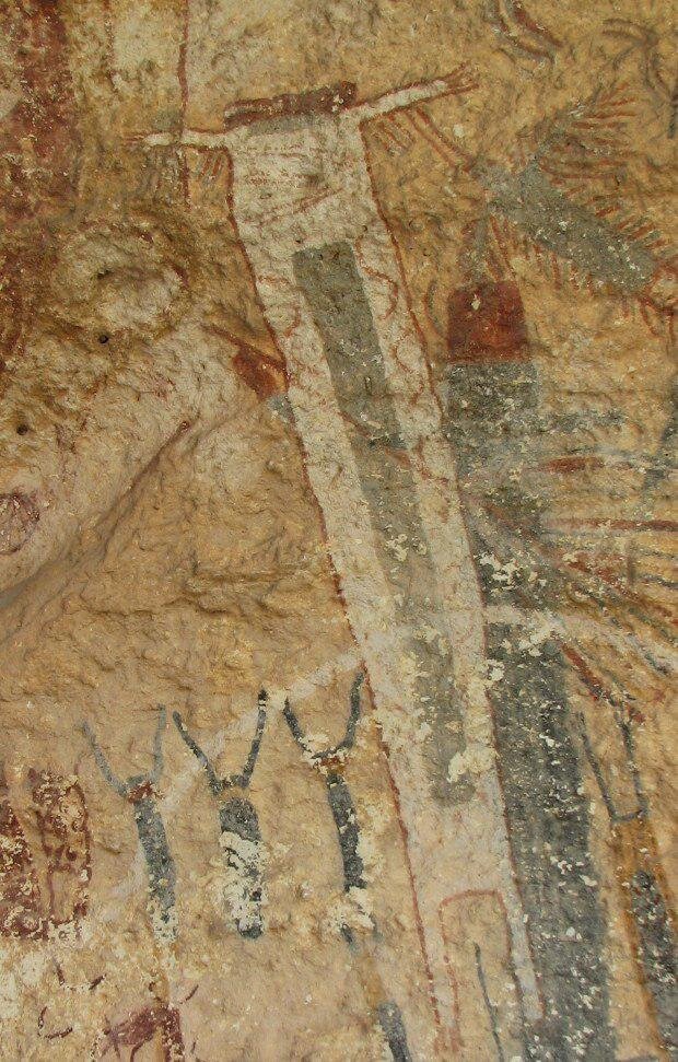 Культура индейцев Америки уже 6 веков будоражит умы учёных и простых обывателей. Яркая, самобытная, полная опасностей и...загадок. Завоевание Америки конкистадорами уничтожило носителей этой культуры, а с их гибелью в могилу ушли многие тайны - узелковое письмо, жертвенные ритуалы, создание рукотворных черепов и многое, многое другое. Отпечаток тайны несёт и настенная живопись индейцев. Археологи находят её в самых неожиданных местах - в пещерах за водопадами, в глубоких расщелинах и высоких горах - не найдётся уголка, совершенно "чистого" от присутствия индейцев. Самый древний, впечатляющий и яркий пример наскальной живописи - "скала белого шамана" в штате Техас, США. Расположенное на глубине 70 метров - самое дно глубокого каньона, изображение поражает своим масштабом - семиметровое изображение, расписанное четырьмя цветами - черным, белым, красным и желтым. Изображение демонстрирует процессию из 6 человек, в центре которой - гротескная белая фигура, возносящаяся ввысь. Учёные
