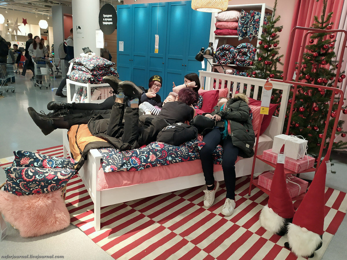 Я шла по магазину, и мое удивление нарастало. На каждой кровати кто-то лежит! Отдыхают, обсуждают. Главное, работники ИКЕА не против. Как только посетители уходят, они молча поправляют экспозицию. Правда это ненадолго, вскоре место занимают снова. В выходные очень много народу.