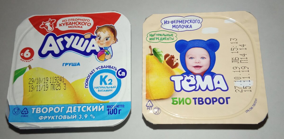 Моей младшей дочери чуть больше года, поэтому к ее питанию я отношусь весьма щепетильно. Сегодня я хочу сравнить детские творожки с наполнителем "груша" двух разрекламированных брендов - "Агуша" и "Тема". Зачем я это делаю? Просто, хочется понять, какой из этих двух продуктов лучше по цене, качеству и вкусу. Итак, в "Пятерочке" я купила два детских творожка "Груша". У них одинаковая масса - 100 гр, но цена разная - баночка "Агуши" - 28,99 руб, а "Тема" - 30,99 руб. Разница уже есть. Продолжим. На обеих баночках указано, что содержимое изготовлено из самых качественных продуктов. Но сравниваю состав: в творожке "Тема" кроме абсолютно безобидный компонентов, как молоко, грушевое пюре, бифидобактерий и закваски молочно-кислых культур, там присутствует зачем-то кукурузный крахмал. А "Агуше" состав практически идентичный, но без крахмала. Несмотря на наличие лимонного сока, наверное, в качестве натурального консерванта, сроки годности у творожков различные - у "Агуши" - 21 день, а у "Темы"