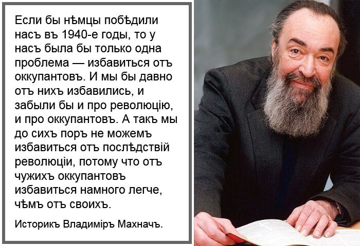 Если бы немцы победили нас в 1940-е годы, в Великой Отечественной войне, то у нас была бы только одна проблема — избавиться от оккупантов. И мы бы от них давно избавились: нас много, территория у нас гигантская. Мы уже давно забыли бы и про революцию и про оккупантов. И немцы, вероятно, жили бы с нами по соседству куда хуже, чем живут сейчас. Посильнее была бы Россия и намного богаче. А так мы до сих пор не можем избавиться от последствий революции, потому что от чужих оккупантов избавиться намного легче, чем от своих.