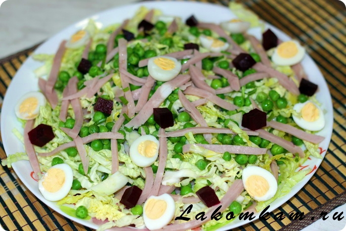 Сочетание этих продуктов в одном блюде не самое обычное, но вкус получится очень удачным. Делаем салат со свеклой, горошком и ветчиной.
