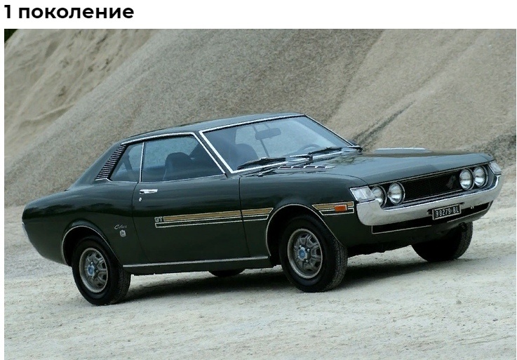 Модель Toyota Celica была запущена в серийное производство в 1970 году. Заднеприводный автомобиль комплектовался четырехцилиндровыми рядными двигателями объемом от 1,4 до 2,2 литров. Коробка передач могла быть механической или трехсупенчатой автоматической. Toyota Celica предлагалась с двух- и трехдверным кузовом. В 1977 году произошла смена поколений. А в 1980 году появился четырехдверный седан Toyota Celica Camry, это была модель Carina, но с дизайном передней части в стиле «Селики».