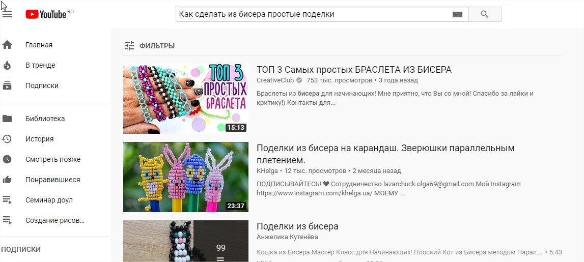 Сегодня научиться рукоделию самостоятельно дома может каждый. Нет ничего проще. На днях дочка начала учиться бисероплетению. Я не умею плести бисером, поэтому из меня учитель никакой. На помощь нам пришел интернет. Открываете Ютуб или Яндекс видео и ищете «Как сделать из бисера простые поделки»: Нам сразу выдал уроки плетения бисером. Дочка за несколько минут научилась. Вот что из этого получилось: Всё показывается подробно крупным планом, просто повторяешь и всё. Если что-то не поняли, перематываем и смотрим. Просто и доступно, никуда ходить не надо. Несколько лет назад именно таким образом я научилась вязать крючком. Спицами вязала со школьных лет, а вот крючком так и не смогла в детстве обучиться. Открыла уроки по вязанию крючком в Ютубе и повторила различные виды петель. Затем изучила схемы и вуаля, теперь спокойно вяжу всякие носочки, цветочки, узоры по схеме. Есть также уроки шитья. Некоторые виды обработки карманов, манжетов, воротников я изучала именно по видеоурокам. Инте