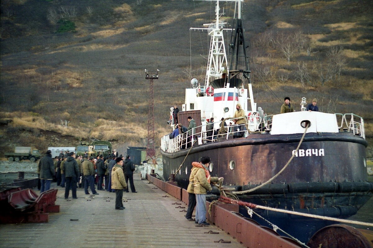 Камчатка, бухта Финвал, она же Бичевинская, 182 ОБРПЛ. Была гауптвахта, но только для в/с до мичмана. Офицеров отправляли отсиживать в Петропавловск-Камчатский. Обычно офицеры брали 0.5 "шила" (С2Н5ОН) и ехали садиться. Там вручали 0.5 начальнику гауптвахты, он ставил красную печать "прибыл-убыл, отсидел-осознал" и офицер был свободен до следующего парохода, ибо пароход ходил в Бичевинку 1-2 раза в неделю, а зимой и раз в месяц, по погоде. Иногда на пароход не успевали, якобы... и тогда 3-5 суток ареста превращались во внеочередной "отпуск" Я лейтенантом получил 5 суток ареста за какую-то ерунду вроде не сданных вовремя зачётов, но когда командир Б-332, капитан 2 ранга увидел мою довольную физиономию, сказал, что не даст добро на сход с лодки в течении месяца, это мне будет полезнее, чем гауптвахта. Это я культурно интерпретирую его слова. В Петропавловск-Камчатский я смог выбраться только через 10 месяцев, в отпуск, в июне 1990 года. На фото тот самый пароход "Авача". **
