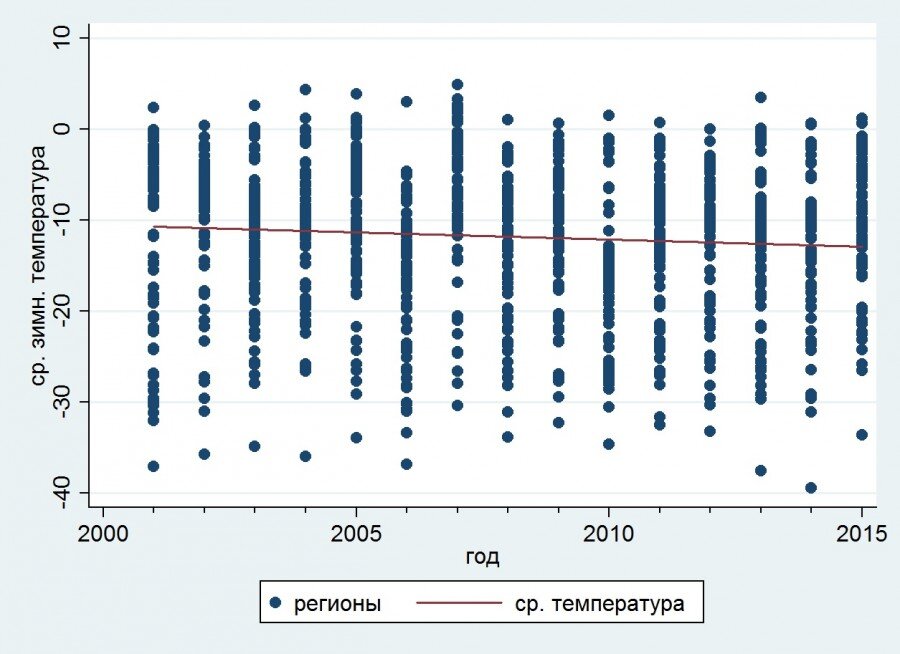 Это легко проверить, сделав соответствующие оценки за весь период 2001-2015 гг. Выбор этих лет связан с тем, что сборники "Основные характеристики субъектов РФ", имеющиеся в открытом доступе, содержат данные по средней температуре в январе и июле по всем регионам только за эти годы.