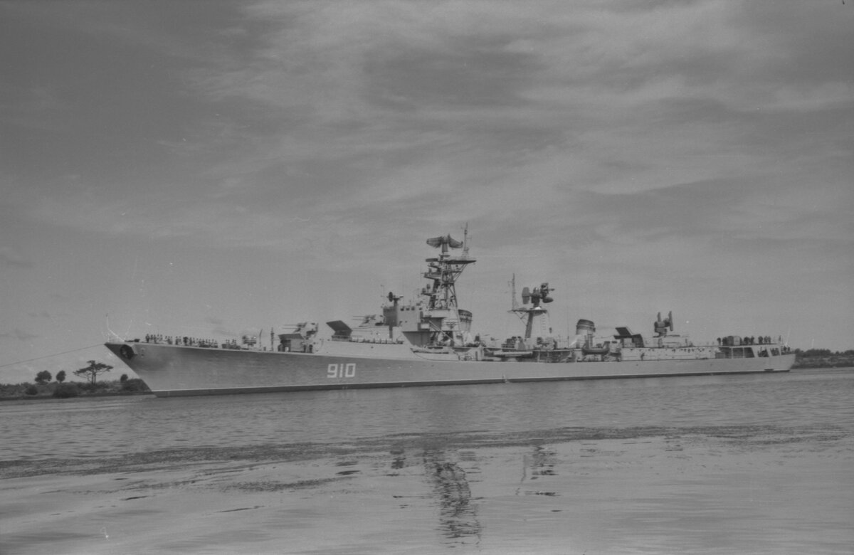 Корабль только что прошёл модернизационный ремонт из БРК "Жгучий" пр.57БИС по пр.57А. Фото сделано в Морском Канале при выводе корабля с акватории верфи. Снимал ныне покойный Натан Григорьевич Масловатый. Интересно то , что установок АК-230 пока нет - их не успевали делать в Туле и корабль получил всё оборудование для установки и работы ЗАК , но самих установок ещё нет. В ходе модернизации , кроме внутренних работ и электрики с электроникой был изменён корпус в носовой части - из-за установки ГАС якоря при подъёме могли пропороть лапами бульб станции и носовую оконечность резко "вытянули" сместив клюзы на самую её оконечность. Так же были сняты пусковые ПКР "Щука" и если в носу на место пусковой переместили 57-мм счетверёнки , то в корме была оборудована площадка для посадки вертолёта и пусковая ЗРК. На корабле поменяли торпедные аппараты и установили РБУ-6000. Вместе с новой ГАС они дали и новую классификацию противолодочного корабля. Получился в целом удачный проект , единственный не