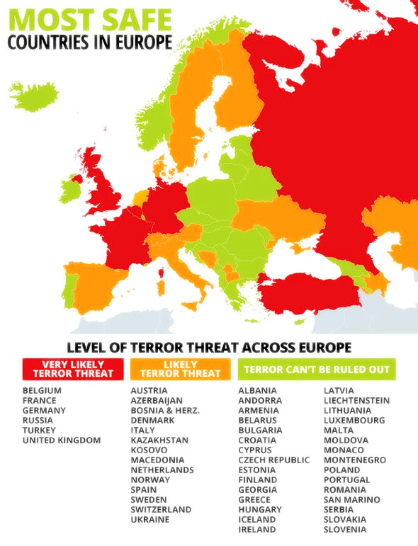 Всем привет! Сегодня я покажу вам одну интересную карту - карту безопасности стран Европы в плане возможности атаки террористов.