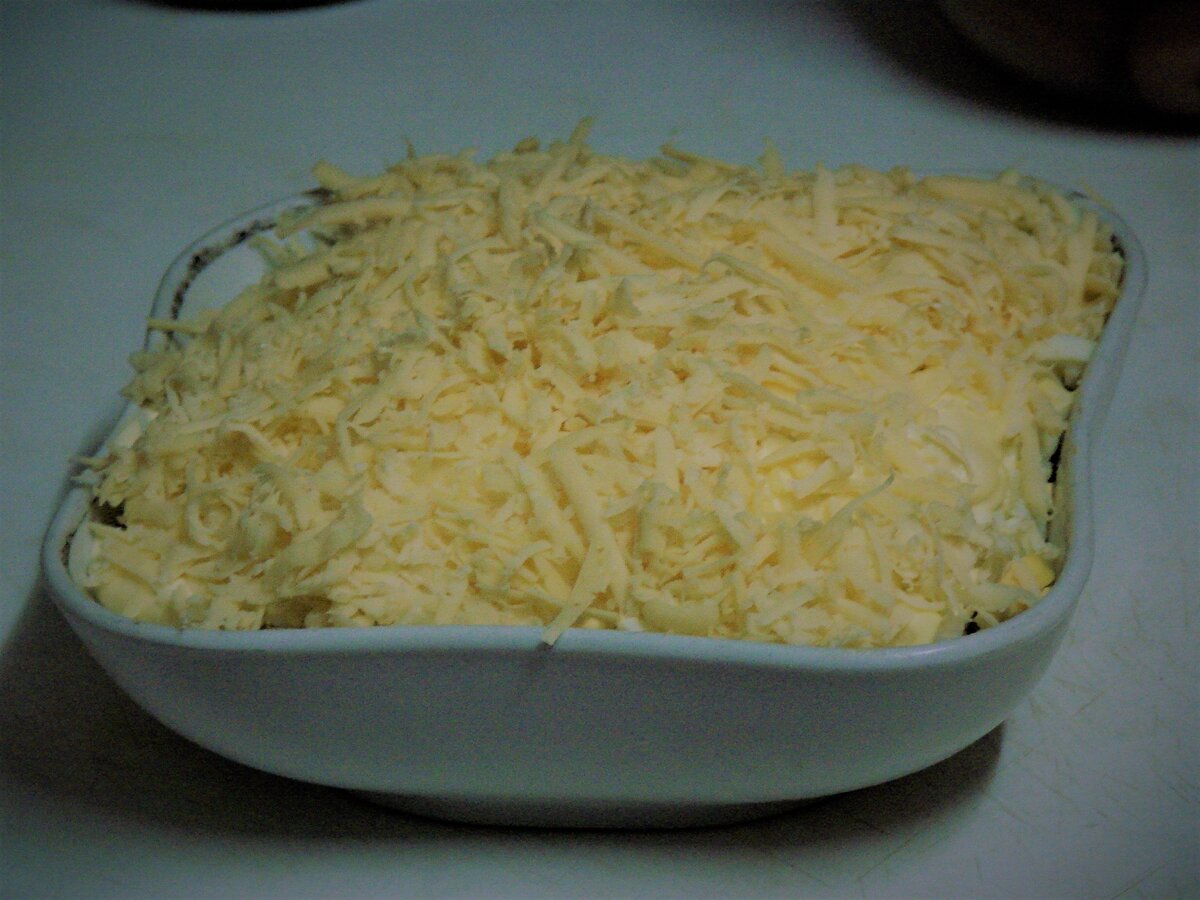 - Сверху салат украсить сыром.