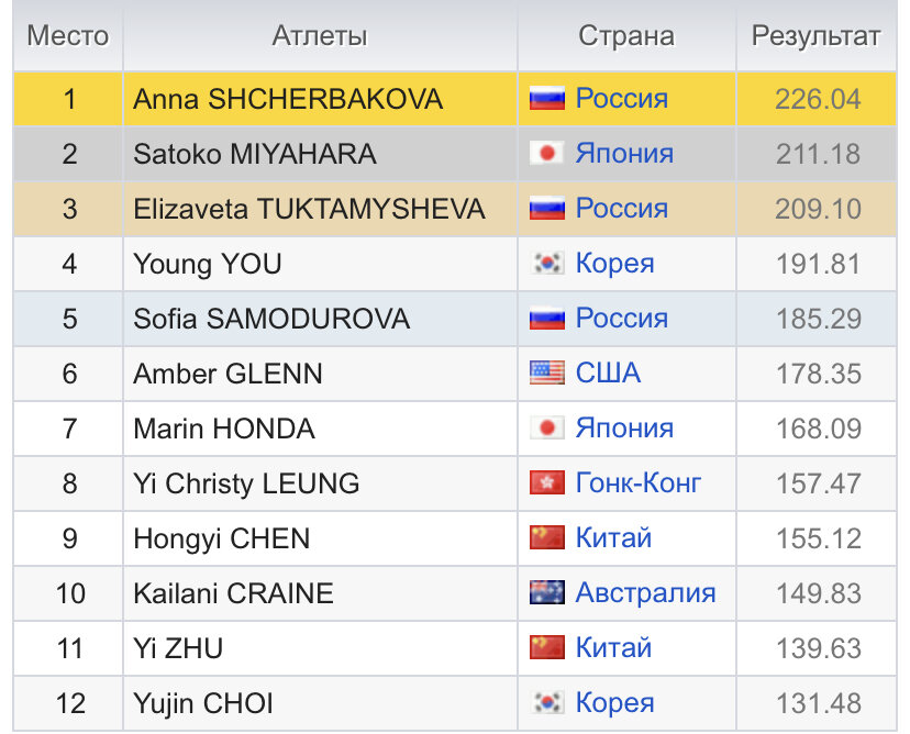 Этап Гран-При в Китае закончился для женщин. Безумно смешанные чувства собрались в душах болельщиков фигурного катания. Итоговые результаты выглядят так: Обзор итогов короткой программы вы можете посмотреть здесь. Выдохнем и посмотрим, что же произошло в произвольной программе. Первой из наших девочек выходила на лёд Софья Самодурова. Очень приятно, что она возвращается к своей привычной форме и снова стабильно катает на соревнованиях. Не знаю, чем так обидела Соня судей, но уже второй сезон она получает заниженные оценки. Мы же все равно поздравим Соф с чистыми программами и пожелаем дальнейших успехов в развитии. Безусловная умница! Второй из наших девочек выходила на лёд Елизавета Туктамышева. В ее руках было попадание на второе место пьедестала с целью попадания в ФГП. Лиза решилась на смену произвольной программы на старую, и это было действительно верным решением. Во-первых, в старой программе у неё платье, которое подчеркивает ее похудевшие ножки. Во-вторых, она так хороша в эт