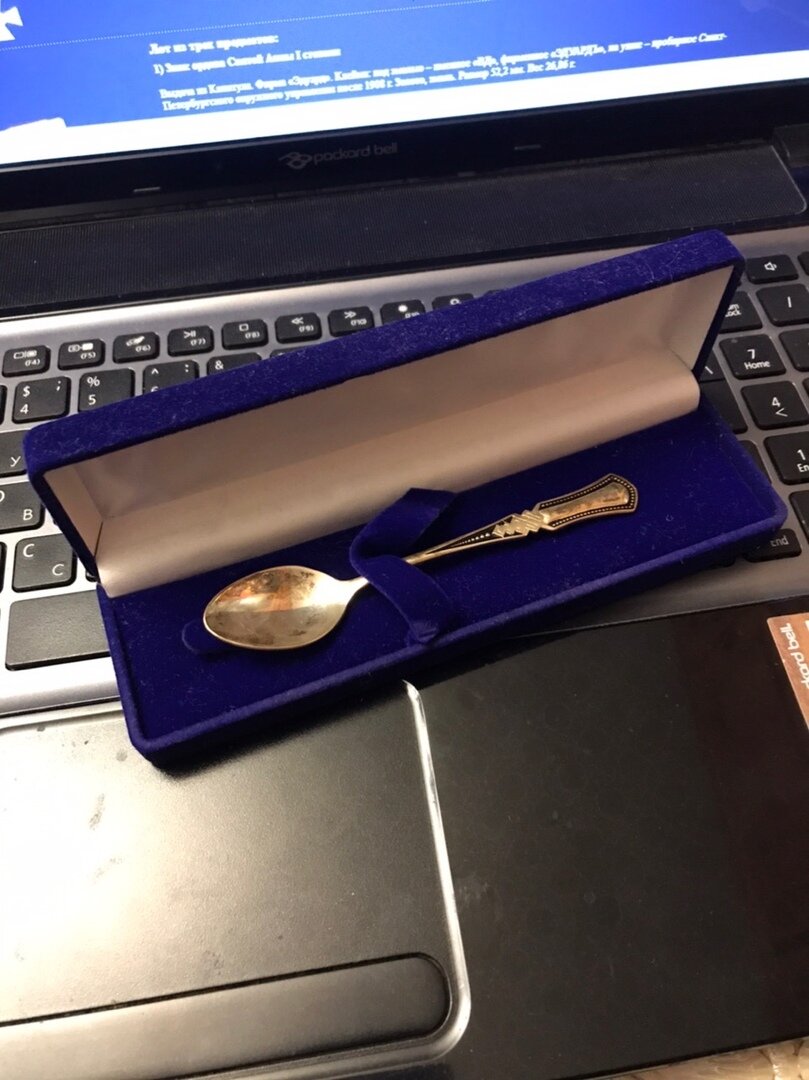 Шесть лет назад родилась дочка и по сложившийся традиции (думаю все так делают), когда прорезался первый зубик, ей подарили серебряную ложку. По традиции нужно прикоснуться серебряной ложкой к зубику и тогда ребенок будет рости здоровым. Кроме того считалось еще со времен Древней Руси, что благородный металл притянет к ребенку достаток, процветание и прочие блага жизни. Сегодня эта традиция активно поддерживается и серебряную ложку могут дарить не только крестные, но и вся остальная родня. Вообще серебро довольно практичный металл, если с него есть или пить, то ионы серебра благоприятно влияют на наш организм. Недаром еще Александр Македонский ел и пил исключительно с серебра, а бывало время, когда серебро стоило дороже золота. У нас ложка осталась в футляре, ей и не пользовались. И вот недавно решил ее достать, посмотреть... А вообще была мысль использовать ее по прямому назначению, то есть пить чай с ней и так далее. Но что вы думаете, достаю я ложку и на лицевой стороне сразу же ви