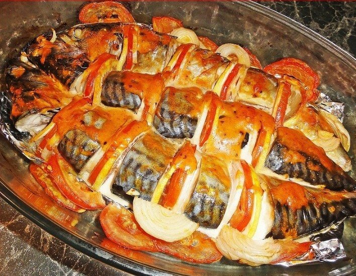 У скумбрии своеобразный вкус, если вы приготовите ее по такому рецепту, то это будет любимой вашей рыбой. Рецепт на повседневный день, а также подойдет на праздничный стол! Понадобится: свежемороженая скумбрия - 3 штуки репчатый лук - 1 шт.,помидорина-1 шт. лимон -1 шт. кетчуп - 2-3 ст. л. майонез - 2-3 ст. л. приправа к рыбе - по вкусу соль и молотый черный перец - по вкусу фольга 1. Разморозить скумбрию, почистить от внутренностей очень тщательно. Помыть под проточной водой. Если вы готовите рыбку на праздничный стол, то стоит оставить голову, если же для себя, то ее можно отрезать. 2. Нарезать рыбку на порционные кусочки, посолить и приправить специями для рыбы. 3. Репчатый лук,помидор и лимон нарезать кольцами толщиной 3-5 мм. (я нарезала полукольцами) 4. Приготовить соус, для этого необходимо смешать майонез с кетчупом до однородности. Обмакнуть каждый кусочек скумбрии в соусе. 5. Лист для выпечки застелить фольгой. Выложить на противень скумбрию, положить между