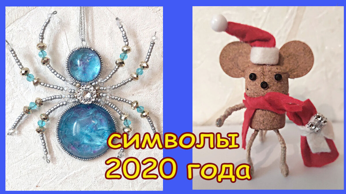 Покажу как сделать славянский и китайский символы 2020 года. По славянскому календарю будет год ПАУКА. По китайскому будет год КРЫСЫ. Паука будем делать из кабошонов, а кабошоны сделаны из эпоксидной смолы. Кабошоны будем наклеивать на фетр . Отдельно делаем 4 пары ножек, нанизываем бусы и бисер на проволоку. Скручиваем их и вклеиваем их между кабошонами , украшаем бисером. Как делала внимательно смотрите в видео, есть нюансы))) Мышку делаем из пробки от шампанского. Отдельно делаем лапки,.Чтобы сделать лапки надо проволоку обматываем джутом и так же хвостик Сделанные лапки и хвостик вклеиваем в пробку. Из другой пробки делаем ушки,. приклеиваем глазки и носик. Делаем из фетра ему шарфик, шапочку и мешок для подарков и одеваем мышонка. И наш мышонок готов. Всех поздравляю с наступающим Новым Годом и рождеством. Заходите на канал там много интересного.