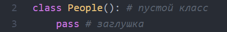 Создание объекта класса Объект - это структура данных, которая может содержать в себе переменные(атрибуты) и код(методы). Когда мы хотим создать свой объект, мы должны создать класс этого объекта. Напишем пустой класс, который ничего в себе не содержит. Класс определяется с помощью ключевого слова class: А создание объекта класса подобно вызову функции: Здесь мы инстанцируем новый объект в памяти, то есть создаем объект класса. Если попробовать вывести значение переменной someone, то увидим следующее: <__main__.People object at 0x000002183913A470> Здесь написано, что someone является объектом класса People и что он находится в указанной области памяти. Это вывелось из-за того, что наш класс ничего не содержит, а его методы(если бы они были) ничего не возвращают. Если же попробовать узнать тип созданного объекта с помощью команды type(someone), то покажет, то что мы и так знаем: <class '__main__.People'> Конструкторы В Python подобно другим языкам программирования есть конструкторы.