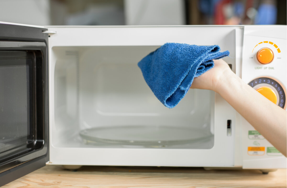 Особой подготовки к чистке микроволновка не требует. Если у вашей печи есть функция очистки паром, то отмыть ее вам не составит труда. Под воздействием пара, жир и загрязнения размокают, их легко убрать салфеткой. В большинстве случаев отмыть микроволновку от застарелого жирного налета и устойчивых пятен помогают следующие методы. Уксусная баня Смешать 1,5-2 стакана воды и 2 столовые ложки уксуса (9%) и поставить смесь в микроволновку, включить максимальную мощность на 10 минут, затем оставить на 5-10 минут и потом обязательно протереть печь влажной тряпкой, чтобы удалить грязь и запах уксуса. Если загрязнения после такой обработки все еще есть, включить печь еще на 10 минут или протереть камеру губкой, смоченной в том же уксусном растворе и присыпанной содой. Если камера микроволновки покрыта эмалью, не рекомендуется использовать этот способ слишком часто. Лимон Чистка лимонной кислотой или соком лимонов (для средних и сильных загрязнений): наполнить посуду водой (400-500 мл), на