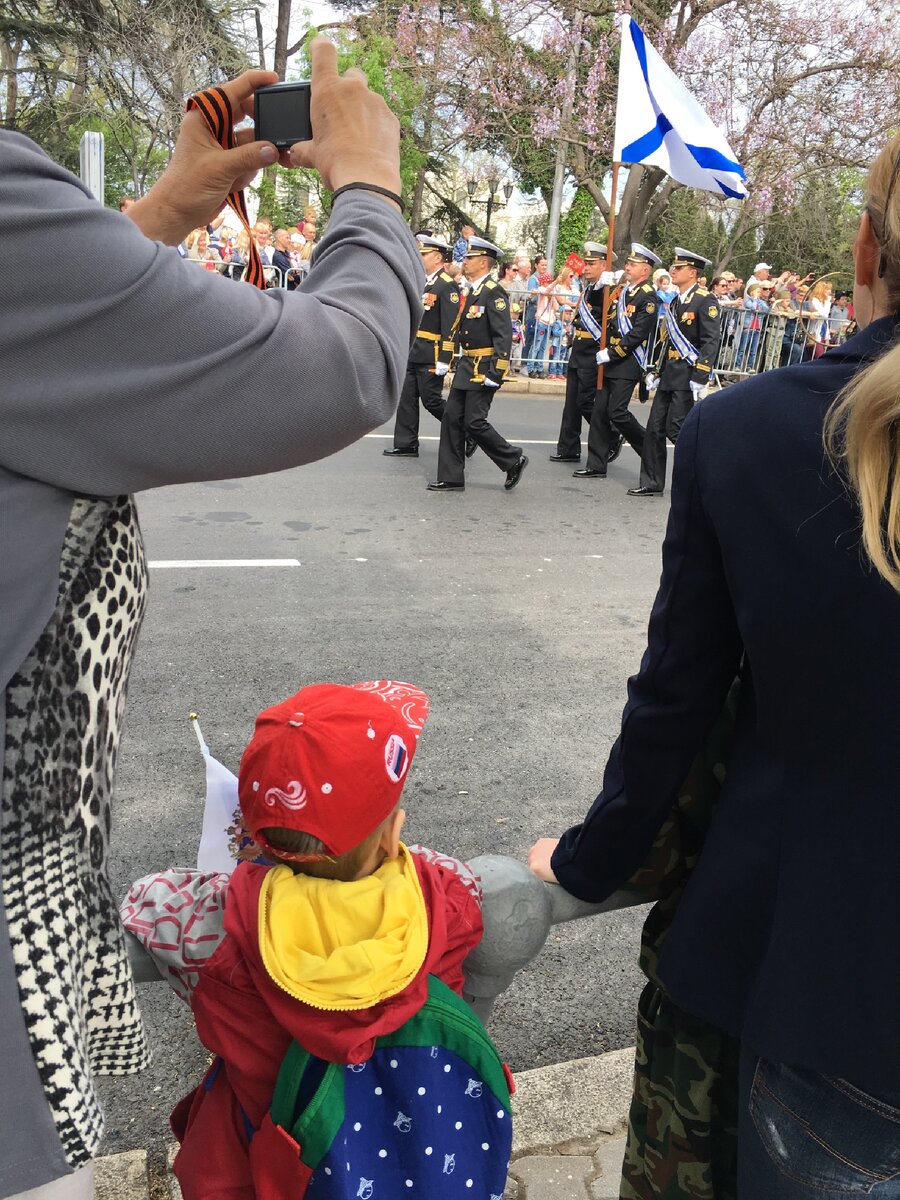 Люблю Севастополь❤️... Любит его и мой сын❤️... Гордится, что живет здесь ❤️.... И пока что немного в силу своего возраста, но знает историю и песни... Начиная с 3х лет, еще живя в Челябинске каждое 9 мая приезжали в Севастополь. Да, было затратнее чем выезд на шашлыки за город, но это того стоит... именно привитие чувства патриотизма в таких праздниках. Да, мы покупали ему форму военного того времени, и он держа в руках портрет своего прадеда вместе со мной шел в строю Бессмертного полка... Да, где-то приходилось нести его на руках... но это ничто по сравнению с эмоциями... Дети должны знать своих прадедов и их вклад в Великую Победу. Обязательно покупали ему цветы и он дарил ветеранам... В 3 года покупала сама и отводила за ручку к ветеранам. Последние два года идет и выбирает сам букетик и дарит сам... потому, что уже все делает осмысленно... Здесь, в Севастополе атмосфера патриотизма на День Победы просто зашкаливает❤️ Такая же ситуация с Днем военно-морского флота. Присутству