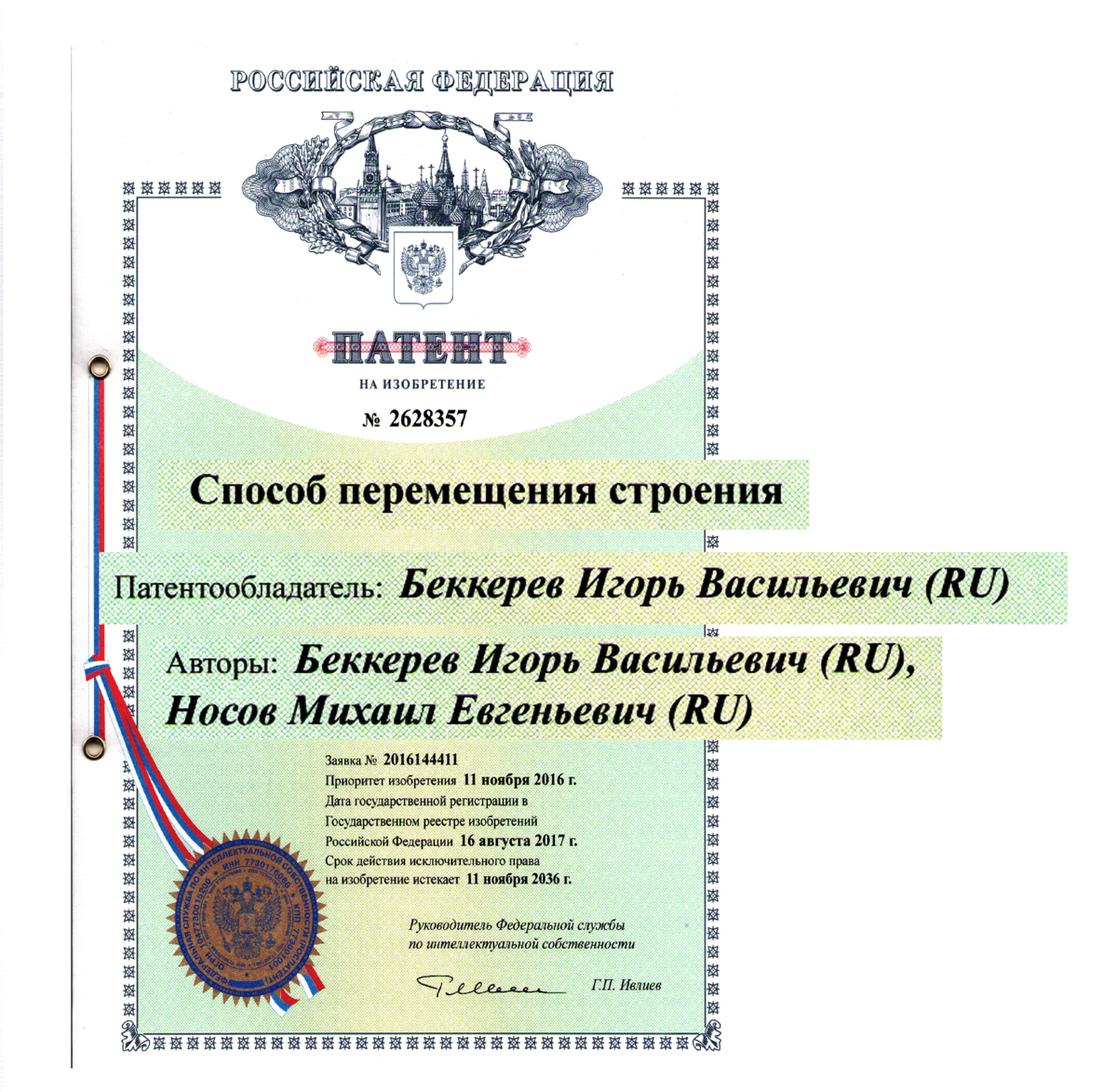 На технологию «способ перемещения строений» был получен патент на изобретение. Сегодня 99% всех передвижек загородных домов производится по этой технологии.