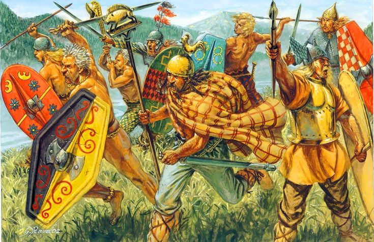 I тысячелетие до н.э. Европа Так были ли у галлов империи? Ученые-антиковеды очень аккуратно обходят этот вопрос, занимаясь материальной культурой галлов, их религиозными воззрениями, вооружением, устройством обществ отдельных народов кельтского происхождения. Оно и понятно. Никто не хочет втягиваться в дискуссии с коллегами по этому вопросу. Уж очень немногочисленны и несколько туманны источники по этой теме. Что же, изложим имеющуюся в источниках информацию. Согласно Юстину, где-то в конце V века до н.э. галлы стали столь многочисленны, что 300.000 из них (1) отправились искать себе новые земли. Часть из них захватили северную Италию и разорили Рим (2). Прочие, силой оружия подчиняя себе местные народы, прошли в бассейн реки Дунай - на территорию Паннонии. Здесь они, подчинив своей власти местные племена, создали центр своего государства. Это государство просуществовало более 100 лет, хотя его название до нас не дошло (не сохранились хроники галлов – ни одна). Галлы постоянно вел