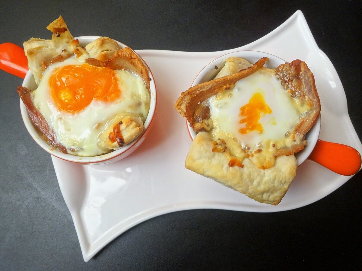 Хотите удивить близких, забыть о сером осеннем небе и обеспечить себе заряд бодрости с утра - приготовьте этот несложный по исполнению, не требующих больших временных затрат, красивый и сытный завтрак. Сегодня я открываю рубрику #это не просто завтрак Главное, достать тесто из морозилки с вечера, и оставить упаковку в холодильной камере. И душевный завтрак отличного настроения ждёт вас! Утром включить духовку на 180 градусов, и приступить к приготовлению. Для приготовления Душевного завтрака на 2 персоны необходимо: Отрезаю два кусочка теста, слегка растягиваю, накрываю ими формы для запекания. Накалываю донышко вилкой и отправляю в разогретую до 180°С духовку. Пока тесто слегка выпекается, готовлю начинку. Разогреваю сковороду, бекон поджариваю на абсолютно сухой сковороде с 2-х сторон, убираю на бумажную салфетку для удаления лишнего жира. Сыр натираю на крупной тёрке. Добавляю к нему зернистой горчицы (любой, которую вы любите), перемешиваю. Проверяю духовку, достаю формочки с тес