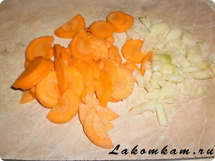 Приготовление картофеля тушёного в сметане. Овощи чистим и режем: морковь тонкими кружками или полукружками, репчатый лук произвольно.