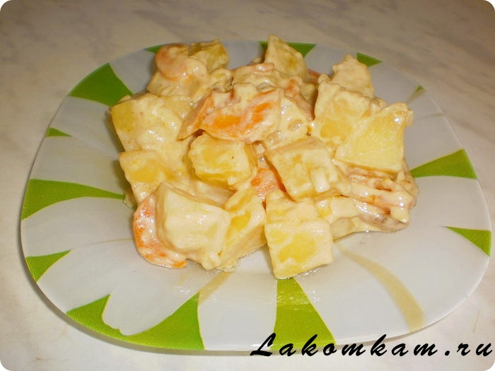 Ингредиенты: картофель — 4-5 штук; морковь — 1 штука; репчатый лук — 1 штука; приправа для картофеля — половина чайной ложки; растительное масло — для жарки; сметана — 150 миллилитров; вода — 100 миллилитров; соль по вкусу.