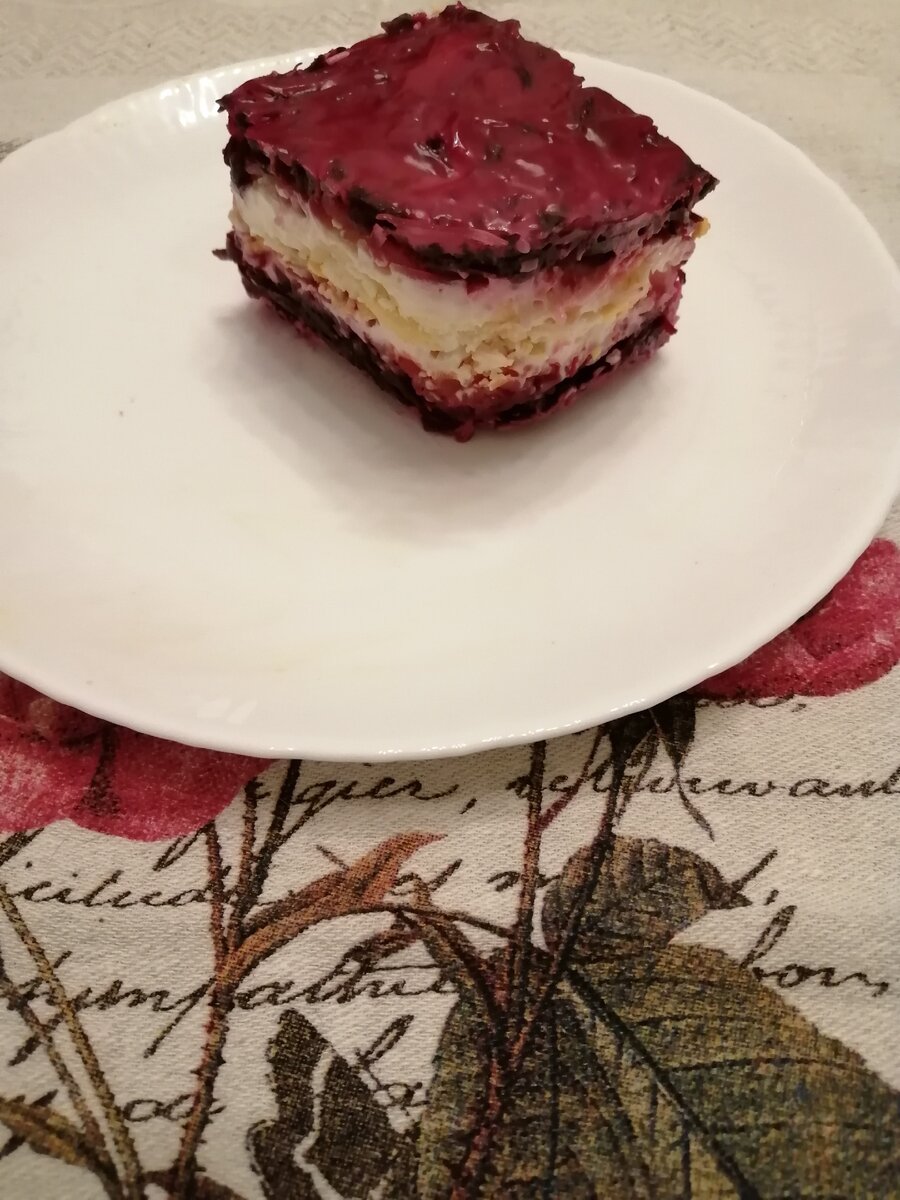 Приготовила такой салат на субботний ужин, подойдёт и для праздничного стола, особенно, если украсить цветами из овощей. Разноцветные слои красиво смотрятся в прозрачном салатнике. Морковь, картофель и свёклу запечь или отварить. Сварить яйца вкрутую. Я натираю овощи на крупной тёрке прямо в салатник, все свои тонкие. Первый слой - картофель, смазать майонезом. Второй - свёкла. Третий - морковь, смазать майонезом. Четвёртый - мелко нарезанный лук. Пятый - яйца. Шестой - тёртый сыр. Любой твёрдый, у меня пармезан. Седьмой - редька, смазать майонезом. В этот раз я заменила редьку репой, с редькой поострее. Восьмой - картофель. Девятый - свёкла, смазать майонезом. Дать постоять в холодильнике минут 30. На следующий день овощной торт становится ещё вкуснее. Картофель - 2 шт. средний, морковь - 1 шт. средняя, свёкла - 3 шт. мелких, лук - 1 шт. мелкий, репа - 1 шт. мелкая, тёртый сыр - 3 ст. ложки, яйца - 2 шт., майонез - 4 ст. ложки Готовила на двоих, треть салата осталась на другой день