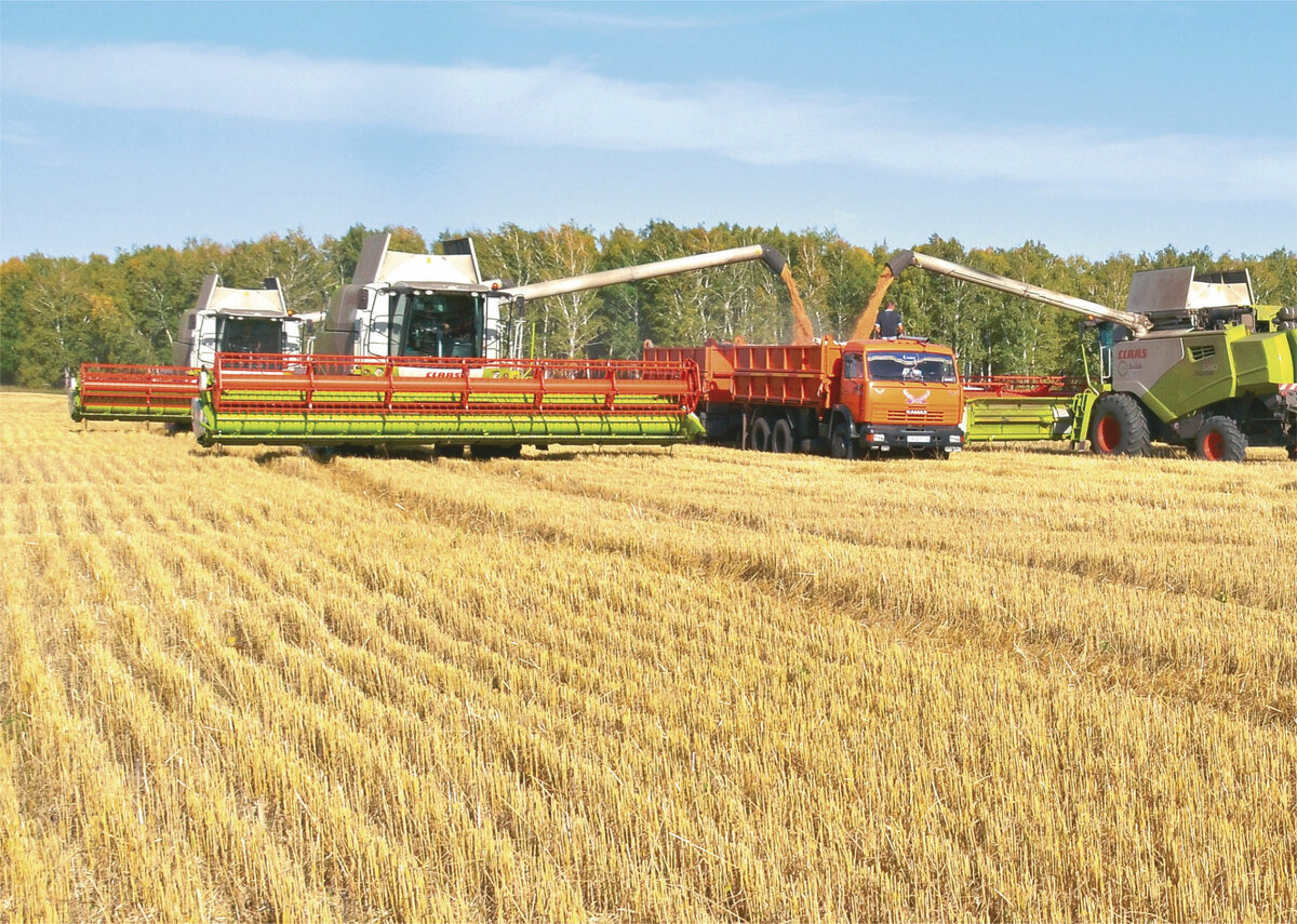 Работает 16 комбайнов, 11 КамАЗов вывозит урожай с полей. В сутки убирают по 600 га, намолачивают в среднем по 1860 тонн.