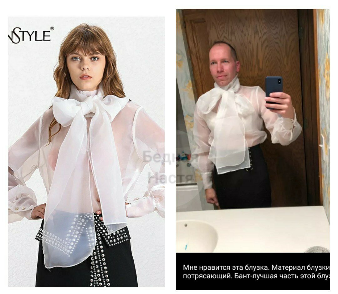 Бывают странные вещи, а бывает, что сама одежда вроде и ничего, но покупателям она не очень подходит по разным причинам. Или они выкладывают странноватые фото в отзывы. Посмотрим на них. Все фото из реальных отзывов и страниц продавцов с aliexpress.com Я считаю, что такие блузки нужно носить не прямо на белье, т.к она очень сильно просвечивает. Но тут покупатель пошел дальше. На фото мужчина, да. И судя по его комментариям, он очень доволен покупкой. Бант, несомненно, украшает эту блузку, немного маскируя то, что под ним. Вообще-то это пеньюар, но женщина решила выгулять его вместе с питоном. Хорошо хоть, что надела под него закрытое белье. Фотосессия - это хорошо, фотосессия со змеёй - это смелое решение. Но все же лучше более тщательно подбирать себе наряд для таких мероприятий. Вроде бы это шорты, но очень странные сами по себе. Мужчина с фото сверху считает, что эта модель подходит для всех полов. Ему виднее, наверное. Но все же, куда в них ходить? В спортивном зале будут косит