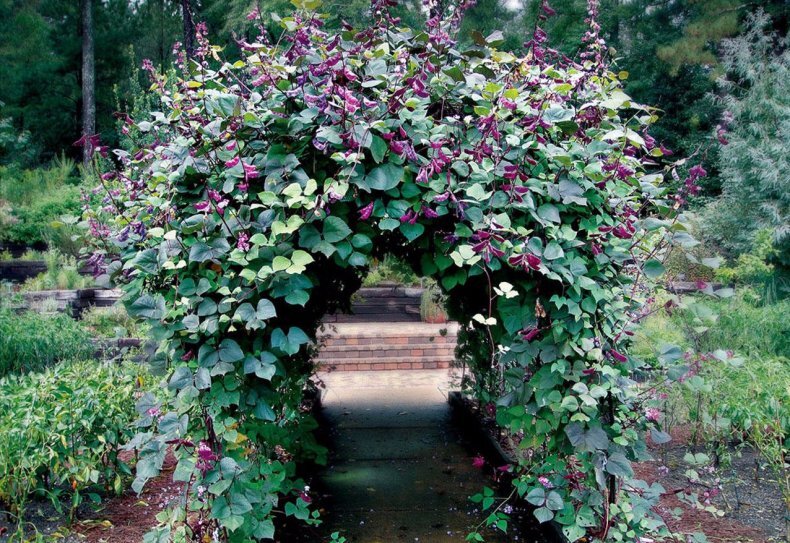 Долихос – однолетнее растение с крупными ажурными листьями. Ее побеги могут достигать 4-метровой длины. Цветки собраны в кисти, продолжительность цветения одного цветка – 3-4 дня, а вся кисть будет радовать вас оригинальным букетом почти месяц. Цветение начинается в середине июня и продолжаться до конца осени или до первых заморозков. При посеве семян нужно руководствоваться главным правилом цветоводов: сеять в отдельные горшочки на глубину, равную трехкратной ширине семени. Сеянцы долихоса хорошо растут и не требуют к себе повышенного внимания. В конце мая, когда минует угроза возвратных заморозков, декоративную фасоль можно смело высаживать в открытый грунт. Пикировку рассады лучше производить в ряд возле вертикальной опоры, высаживая ее на расстоянии 40 см растение от растения.Когда побеги вырасту
