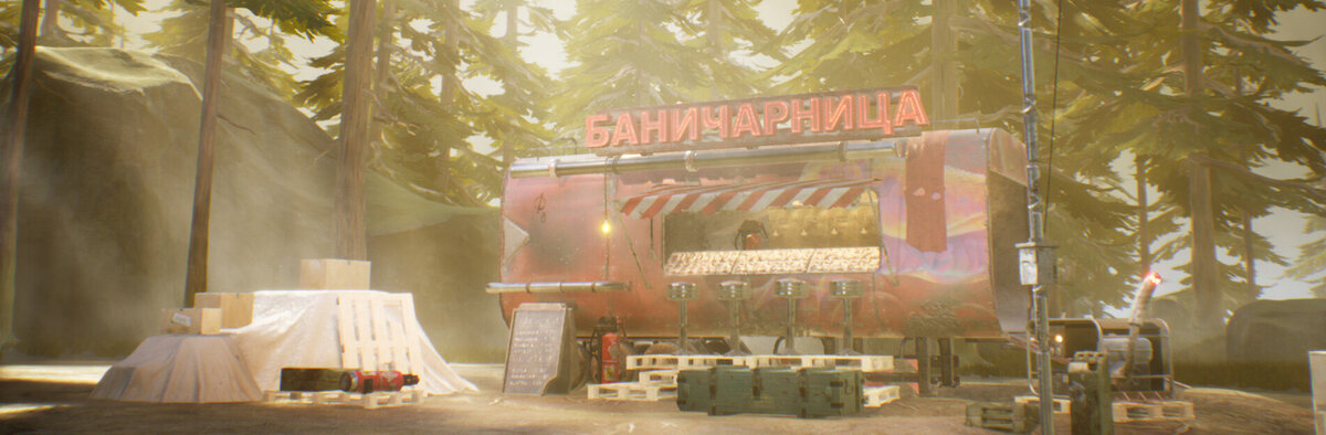 Сначала мы хотели сделать реал-тайм окружение. Идея была в создании тележки с едой, эдакую пост-апокалиптическую версию пекарни на колесах, Баничарницу, в которой выпекаются традиционные для Болгарии Банички. Мы хотели привлечь внимание людей из Восточной Европы, потому что, к сожалению, здесь не очень многие знают о CGI и разработке игр, поэтому мы хотели бы изменить это.
